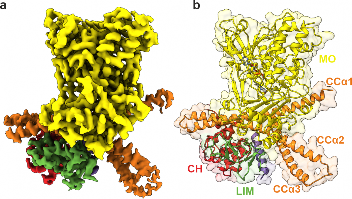 (b) Detailní pohled na strukturu proteinu MICAL1 v autoinhibičním stavu.