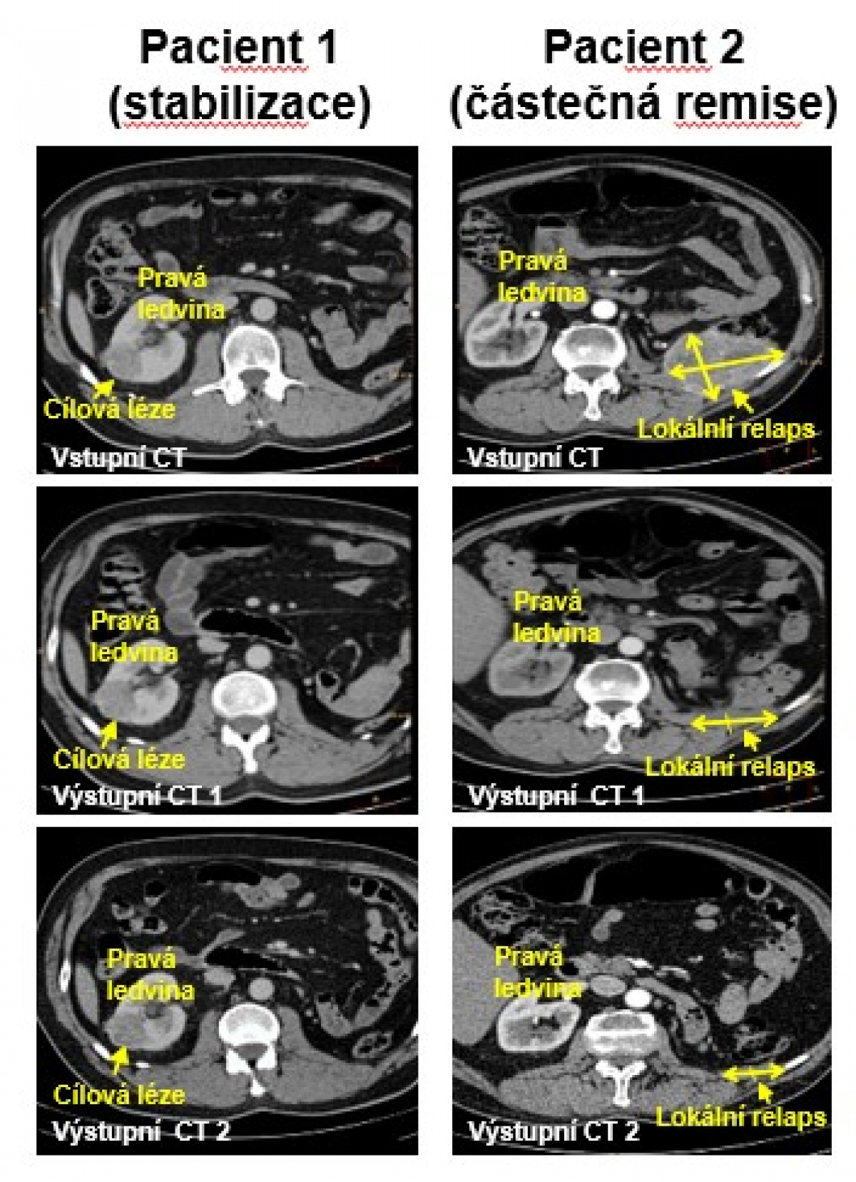 Obrázek: CT skeny nádorů ledvin (metastáz) před léčbou a po léčbě. Pacient 1 – stabilní cílová léze a všechny metastatické nádory. Pacient 2 – lokální relaps v chirurgickém lůžku po odstranění levé ledviny: zmenšení objemu nádoru ze 150 cm3 na 5 cm3, asi 30-tinásobná redukce. Několik metastází je stabilizováno, jedna metastáze v měkké tkáni (poblíž sleziny) není detekovatelná.