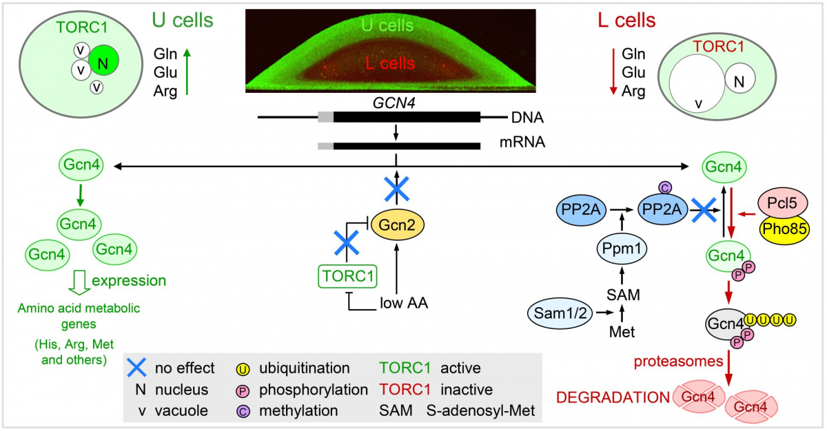 Tato regulace, která je nezávislá na Gcn2p kináze nebo jiné transkripční nebo translační regulaci, má za následek stabilizaci a zvýšenou aktivitu Gcn4p v přítomnosti aminokyselin, zatímco k jeho degradaci dochází při nedostatku aminokyselin. Tato regulace se v některých aspektech podobá regulaci savčího orthologu Gcn4p, transkripčního faktoru ATF4, za specifických podmínek regulace inzulínem.