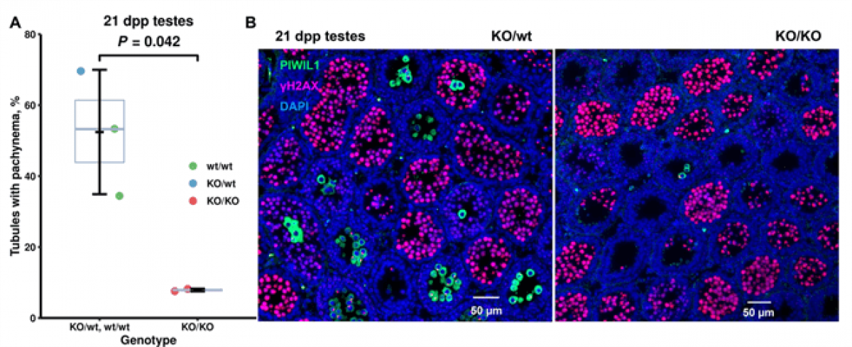 A, B: Imunohistochemie 21-denních varlat. U každého zvířete (znázorněného v grafu jako jeden bod) bylo hodnoceno 154 až 368 kanálků na přítomnost buněk s exprimovaným proteinem PIWIL1. A, Graf (autor: T. Kobets). B, Reprezentativní fotografie (vlevo je kontrola, vpravo samec s inaktivovanym Prdm9; foto: O. Mihola).