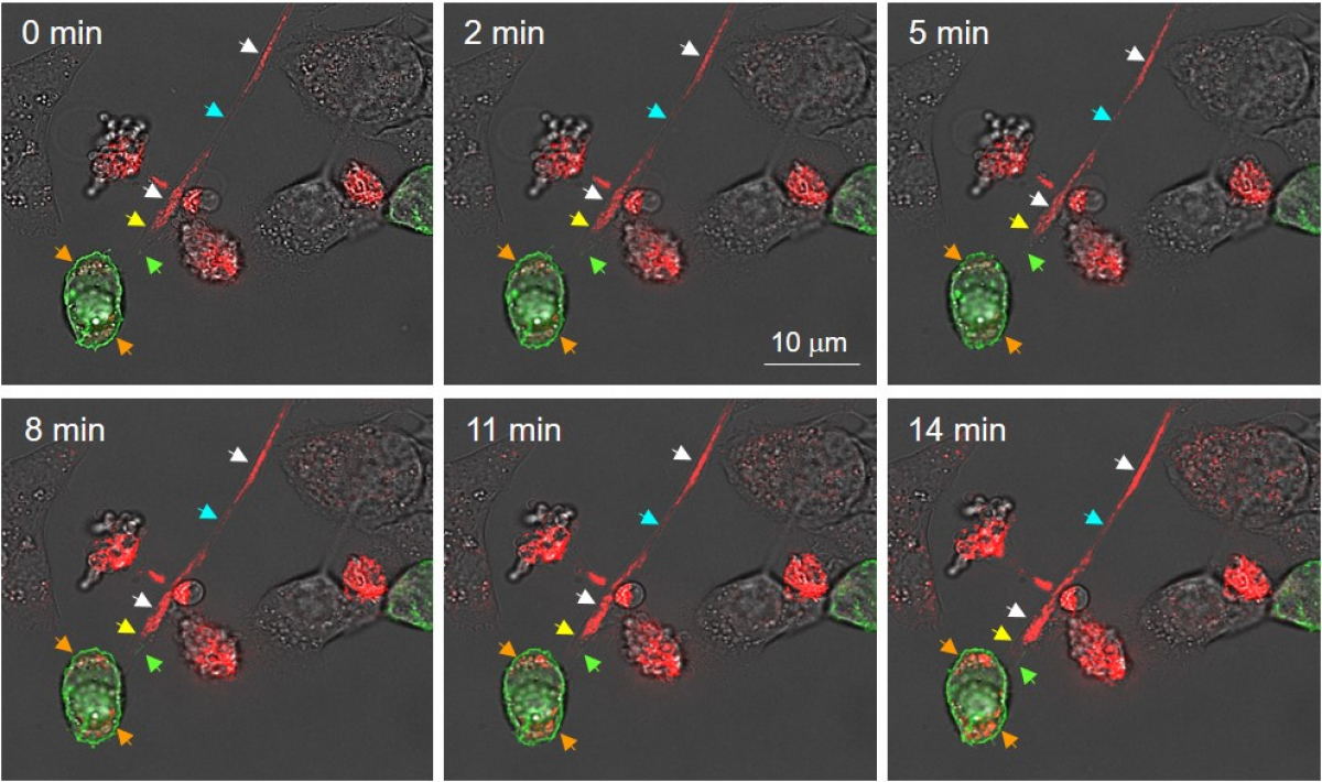 Obrázek ukazuje přesun mitochondrií z mezenchymálních kmenových buněk označených červeným fluoroforem, které putují tzv. nanovlákny do příjemcovských nádorových buněk s porušenou mitochondriální DNA označených zeleným fluoroforem.
