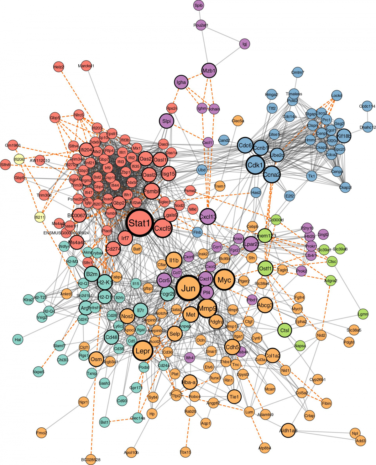 Skupiny genu vykazující nadměrnou aktivaci u starých myší trpící ischemickým poškozením (geny interferonové signalizace vybarveny červenou barvou)