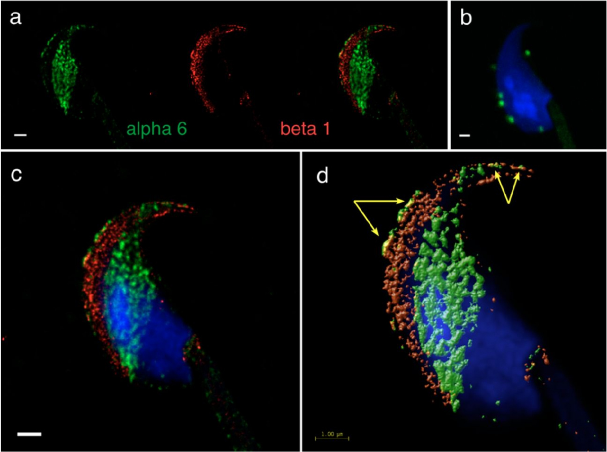 Obrázek - Vzájemná lokalizace α6 and β1 integrinových podjednotek a přítomnost α6β1 heterodimeru v hlavičce spermie myši detekovaná pomocí STED superrezoluční mikroskopie (a,c); proximity ligation assay (b); vizualizace kolokalizace (žluté šipky) pomocí Huygens software založeného na Pearson’s korelační koeficient (d).