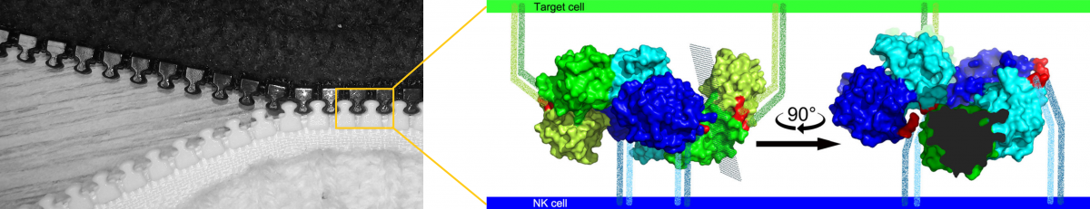 NK buňky (z angl. natural killer cells, přirození zabíječi) patří mezi bílé krvinky. Jejich název je odvozen od vrozené schopnosti zabíjet poškozené buňky v těle, např. rakovinné buňky nebo buňky napadené virem. K tomu, aby poznaly, zda je nějaká buňka poškozená, využívají kontakt mezi povrchovými receptory těchto buněk. Nově publikovaná studie přináší detaily kontaktů dvou konkrétních receptorů a nově osvětluje proces důležitý pro imunitní odpověď, konkrétně jak NK buňka získává signál, který dále vede k rozhodnutí “zabij” nebo “nech žít”.