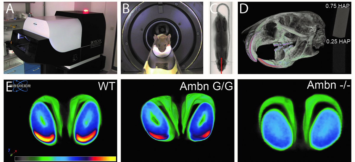 E - Snímek průřezu řezáků myší z microCT. Nejvíce mineralizovaná část skloviny je znázorněna žlutě (nasnímána byla běžná myš). U geneticky upravených myší druhý snímek zobrazuje úbytek mineralizované části zubní skloviny a na třetím snímku zcela chybí zubní sklovina