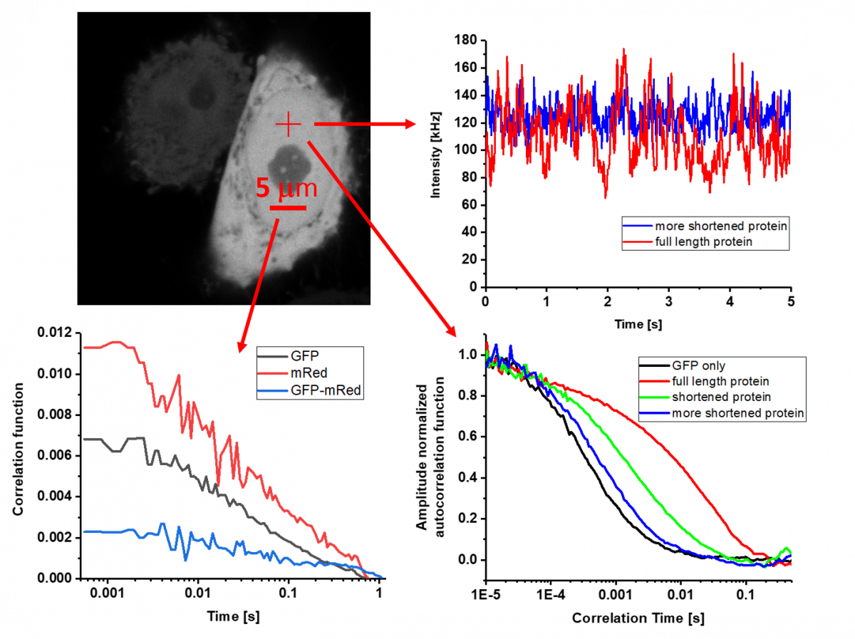 Extrémně malé femtolitrové detekční objemy vytvořené nejlepšími objektivy na trhu umožňují analyzovat až sto-nanomolární koncentrace, které jsou již relevantní pro přirozené buněčné prostředí. Výhoda bodové FCS je, že zvládne pokrýt časovou škálu od nanosekund až po jednotky sekund. Pokud sledujeme pomalejší pohyby a rádi bychom znali i prostorové rozložení získávaných parametrů, lze s úspěchem aplikovat řádkovou či zobrazovací FCS (line-scanning FCS a Imaging FCS) a další odvozené metody. Czech-BioImaging nabízí v této oblasti některé unikátní metody, vyvinuté přímo odborníky v servisních laboratořích, které nejsou dostupné jinde ve světě.