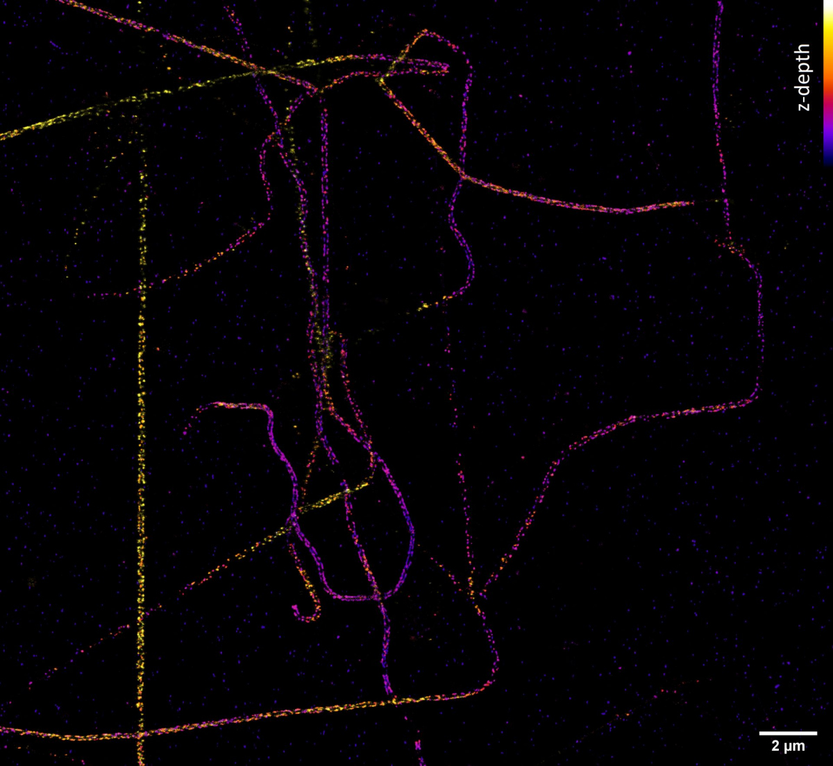 Jak ale dosáhnout rozlišení na úrovni desítky nanometrů a lepší, které potřebujeme například k určení uspořádání jednotlivých proteinů ve velkých proteinových komplexech? Poměrně snadno. Pokud víme, že v daném místě a čase snímáme pouze jednu jedinou molekulu, tak ačkoliv kamera nám zobrazí rozmytý difrakční obrazec, fluorescenční molekula se nachází přesně uprostřed. Přesnost lokalizace molekuly pak závisí na její svítivosti a kvalitě mikroskopu – a dostává se až k nanometrům! Metoda lokalizace jednotlivých molekul (SMLM, Single Molecule Localization Microscopy) spočívá v náhodném přepínání molekul ze svítivého do temného stavu tak, aby v daném místě a čase svítila statisticky vždy maximálně jedna. Tedy když kvůli difrakci nedokážeme emisi jednotlivých molekul rozlišit v prostoru, rozlišíme ji v čase. Komerční SMLM mikroskopy dokáží získat mapu lokalizací s přesností typicky kolem 10-20 nm v rovině ostrosti xy a 30-50 nm v ose z. Rozlišení obrázku však není většinou limitováno lokalizační přesností, ale kvalitou použitého vzorku, zejména jak hustě a kvalitně se podařilo vzorek označit.