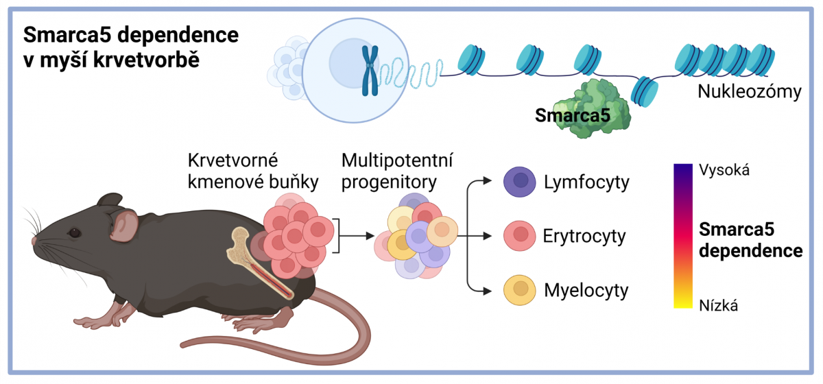 Tvorba krevních buněk závisí na koordinované regulaci genové exprese, načasování buněčného cyklu a potlačení nesprávných procesů apoptózou. Jako každá kmenová buňka se i krvetvorná kmenová buňka zabývá rovnováhou mezi kmenovostí a diferenciací, ale také kvantitativními požadavky na produkci různých prvků v určitých fázích vývoje a během každodenních situací, které mohou zahrnovat krvácení nebo infekce. Různá rozhodnutí v buněčném jádře kmenových buněk souvisejí se strukturou DNA, která je zabalena do klubka histonových bílkovin. Různé kritické sekvence musí být zpřístupněny, a to se děje pomocí enzymatického motoru, který s vynaložením energie uvolňuje DNA z histonového oktameru, nazývaného nukleozom, a vytváří tak oblast volně přístupné DNA, zatímco jiné nepotřebné sekvence DNA jsou smotány jako nit na cívce. Rozvolnění vlákna DNA z nukleozómu se nazývá remodelací chromatinu. Obecně se má za to, že kmenové buňky mají velmi omezenou genovou expresi a replikaci, a proto nás zajímalo, jak jsou jednotlivé krevní podtypy závislé na funkci enzymatického motoru remodelace chromatinu v kmenových buňkách během jejich časné diferenciace. Konkrétně jsme testovali jaderný chromatin remodelační enzym ISWI ATPázu SMARCA5 (SNF2H) v procesu vývoje lymfocytů, erytrocytů a dalších krevních buněk.