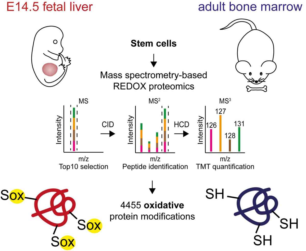 Obrázek: Pomocí redoxní proteomiky jsme identifikovali proteiny, které jsou cílem oxidačních změn ve fetálních a dospělých krevních kmenových buňkách. Oxidace těchto proteinů tvoří další regulační vrstvu během vývoje fetálních krevních kmenových buněk a může hrát roli při vývoji leukémie.