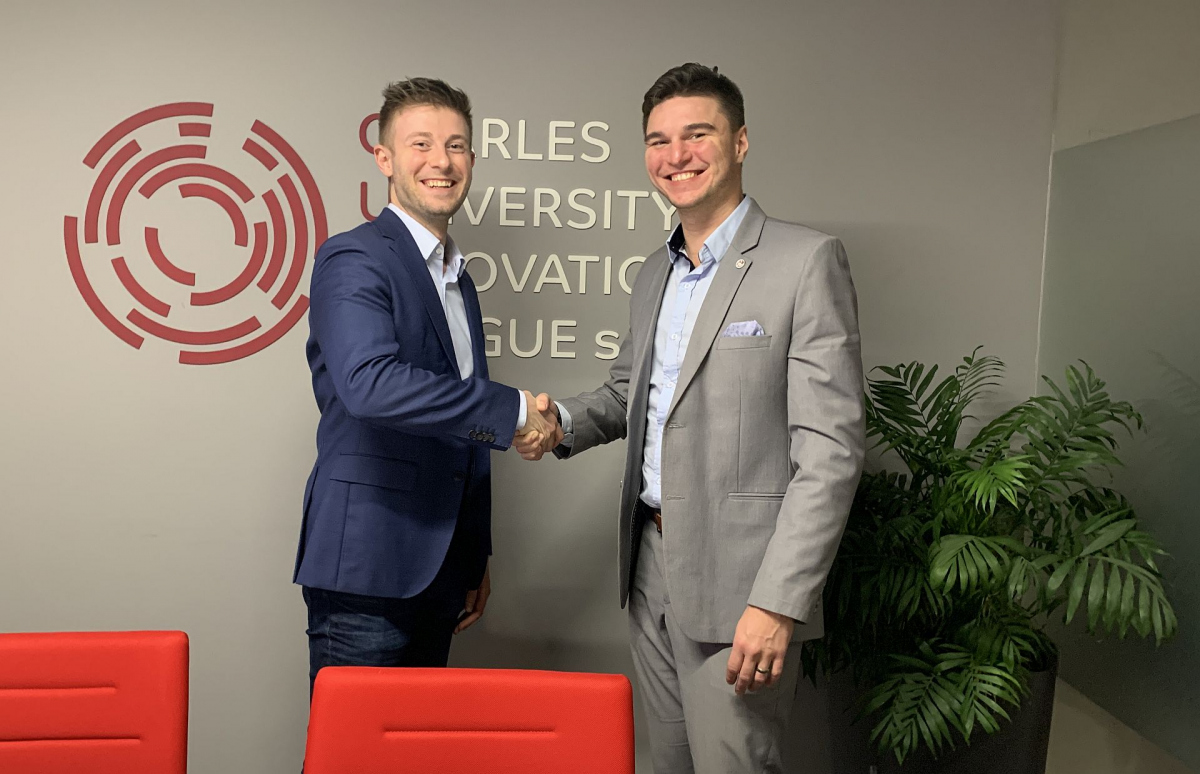 Foto: Podpis smlouvy o převodu patentu mezi společností Oxygen Biotech a Charles University Innovation Prague (CUIP). Vlevo zástupce společnosti Oxygen Biotech Tomáš Pacák, vpravo Otomar Sláma, předseda správní rady CUIP.
