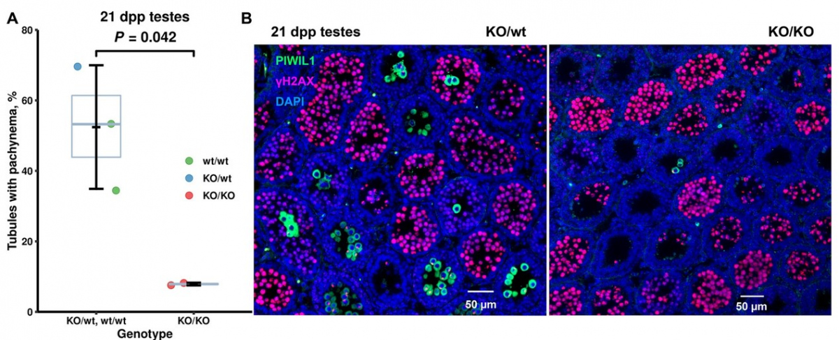 A, B: Immunohistochemistry of 21-days-old testes. Tubules were scored for the presence of cells expressing the PIWIL1 protein (154 to 368 tubules per animal, each animal depicted as a single dot in the plot). A, Plot (author: T. Kobets). B, Representative images: left, control; right, Prdm9-deficient male; photo: O. Mihola).