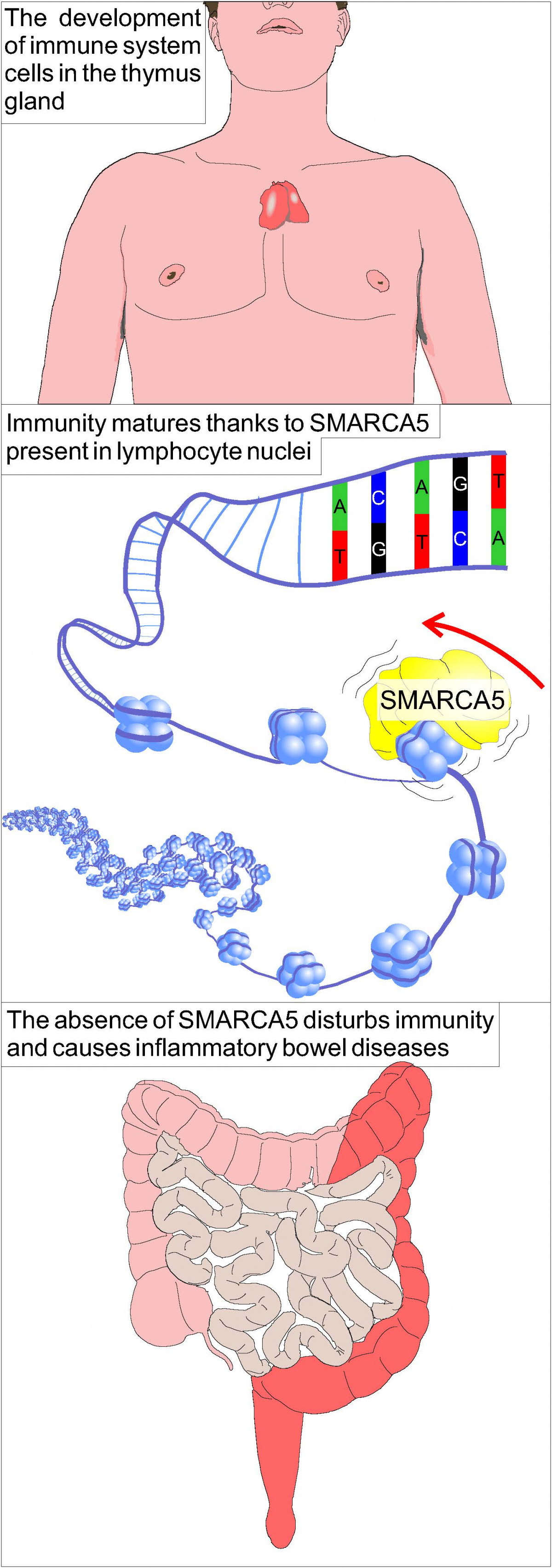 The majority of immune cell functions is coded in a genetic sequence of DNA molecules. “For a DNA molecule, which is up to 2 metres long in every cell of the human body, to fit in the cell nucleus, it must be “wound” to specific proteins that enable its thickening. We can visualize this as a thread wound around a coil, which means that a lot of information is completely hidden. However, this thickening causes difficulties when reading the genetic information, which means that in the past, the enzymes that enable researchers to effectively decode a four-letter DNA code by molecular reading tools in the cell nuclei must have developed in primitive microorganisms. The tools also include remodelling enzymes such as protein Smarca5, which we researched,” adds Tomáš Stopka. “If we had not focused on researching how the genetic code is read in lymphoid cells, we would have never recognized that colitis can develop in mice with disturbed T lymphocyte maturation. This confirms our initial hypothesis that a number of complex diseases are caused by the information that a cell reads,” says Tomáš Zikmund, one of the authors of the prestigious publication.